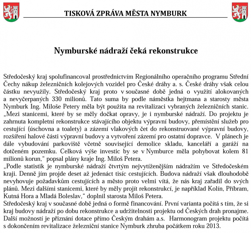 Každopádně, pokud mají o osudu historické budovy nádraží v Nymburce skutečně rozhodnout obyvatelé města, mělo by být zorganizováno oficiální referendum. Nedávno byly volby do krajských zastupitelstev, takže k tomu byla příležitost. V některých městech toho využili, např. Lysá nad Labem hlasovala o prodeji městských bytů v Milovicích. Nebo máme brát vážně, že někdo bude takto závažná rozhodnutí činit na základě pochybné a neprůkazné SMS ankety?