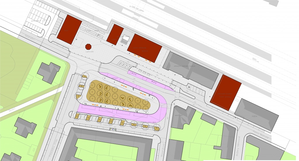 I přes poněkud nepříznivá prostorová omezení se podařilo navrhnout čtyřřadé kolmé stání osobních automobilů a další řadu podélného stání při jízdním pruhu ulice Nádražní. Efektivně byla začleněna i komponovaná výsadba stromořadí na základě doporučení externího poradce města, který spolupracoval i při přípravě návrhu přednádražního prostoru. Na západním konci řešeného území je plánována odstavná plocha pro autobusy s obratištěm a základním zázemím pro řidiče autobusů.