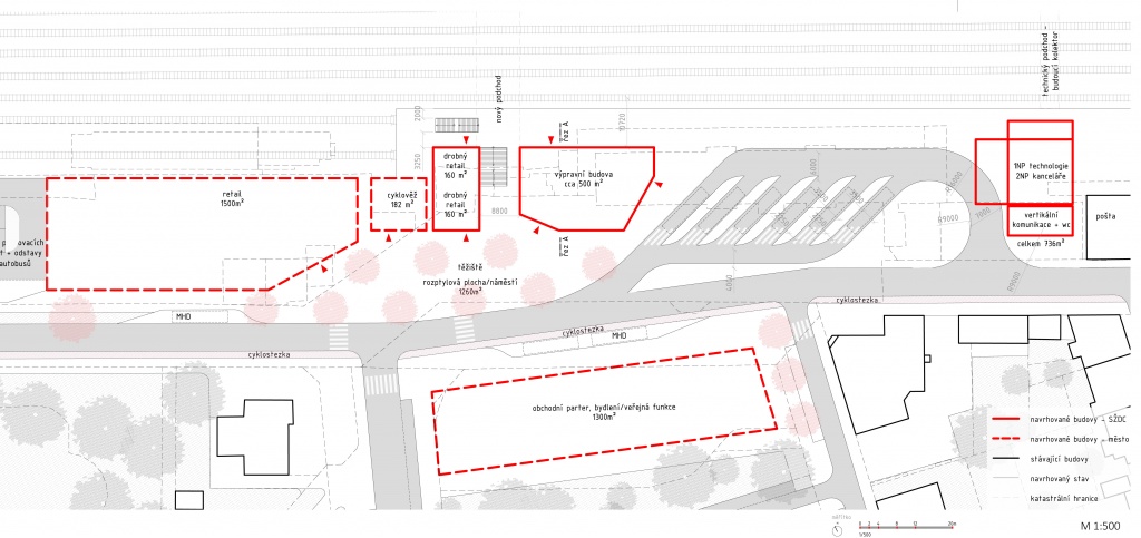 V obou variantách byla odstraněna východní přízemní přístavba, ve které nyní funguje nádražní restaurace. Ta uvolní místo novému provoznímu objektu, kam budou umístěny veškeré technologie, které vyžaduje železniční provoz. Celá záležitost je nyní předmětem vzájemné koordinace projektů a případného majetkového vypořádání mezi městem a SŽDC.