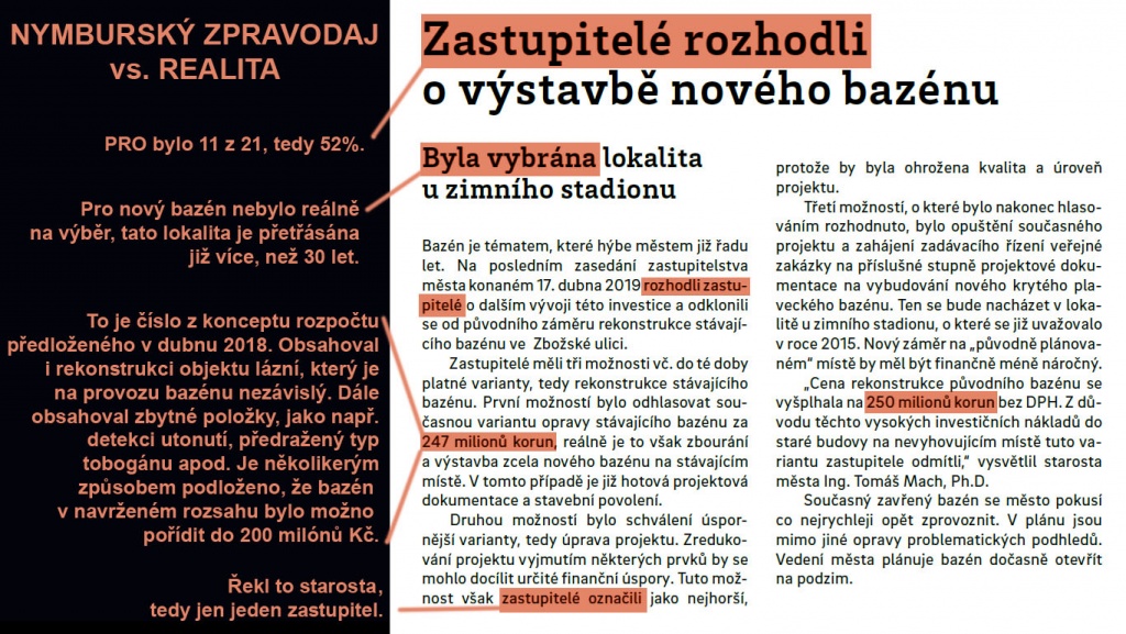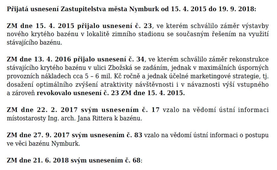 Závěr: Záměr, ke kterému se město včera těšnou většinou hlasů zastupitelů po několikáté vrací, není sám o sobě špatný. Špatné je, že jsme ztratili 3 roky, investovali včetně DPH přes 3 milony korun a věnovali obrovské množství práce mnoha lidí jen proto, abychom zjistili, jak by nový bazén na Zbožské mohl detailně vypadat a kolik by ve skutečnosti stál.