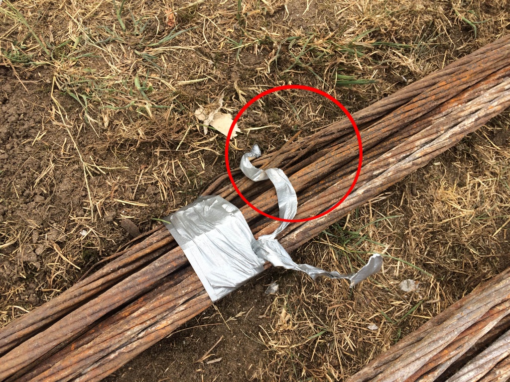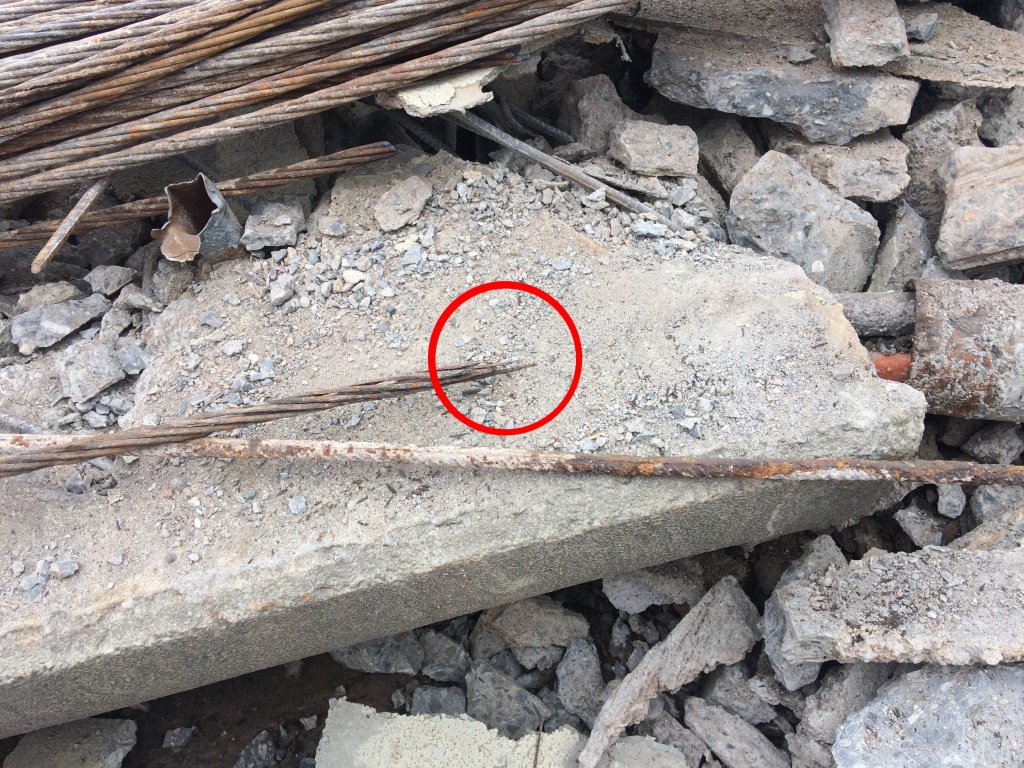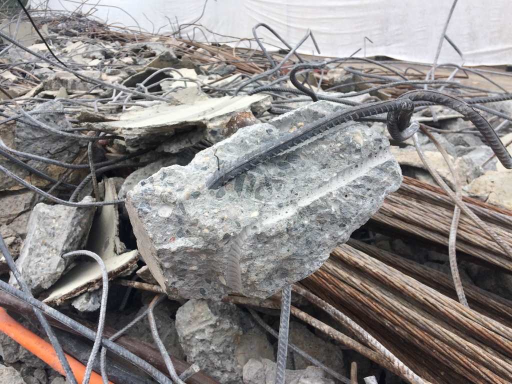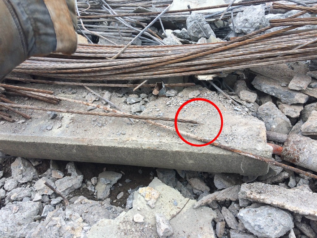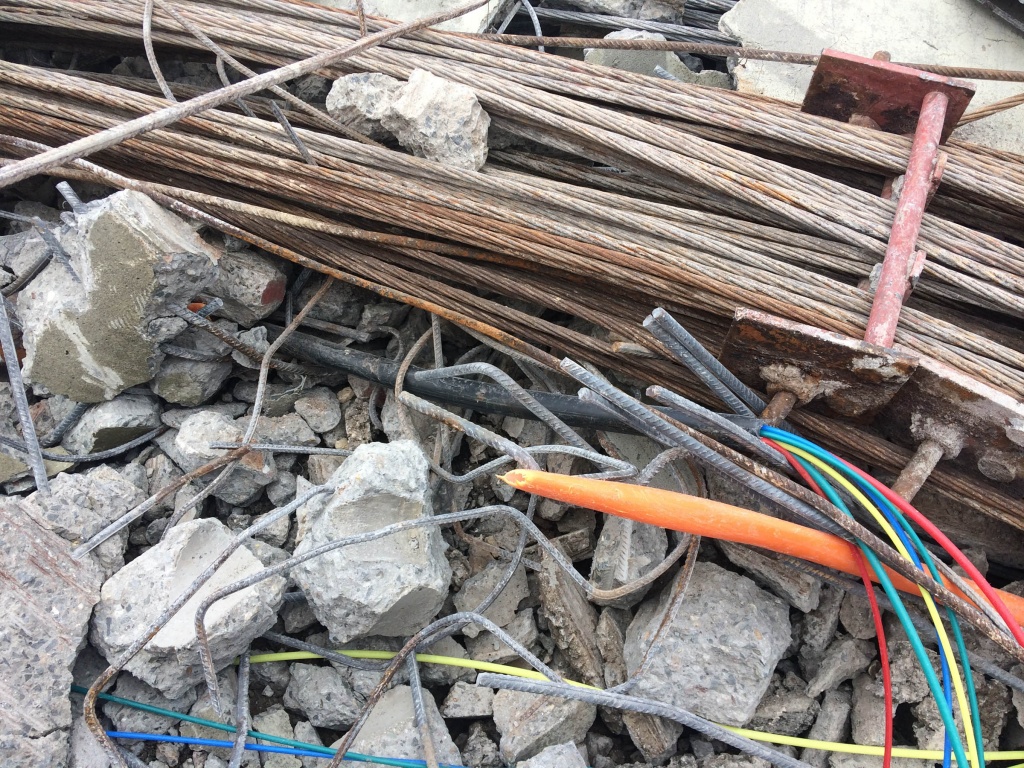 Při dalším rozbíjení konstrukce se postupně nachází další a další části zkorodovaných nosných a předpínacích lan. Na řadě míst byly objeveny dokonce přetržené ocelové dráty, které postupně v konstrukci při jejím provozu takto praskaly a zvyšovaly tak riziko náhlého kolapsu. Jedno takové místo je patrno např. na fotogafii z místa cca 2 m od konce předpjatého pásu na zálabské straně – označeno červeným kroužkem. Z obrázků je také patrný zcela jednoznačný rozdíl naprosto zdravé betonářské výztuže, která byla kvalitně zabetonována v jednotlivých betonových prefabrikátech a zkorodované soustavy průběžných nosných lan, které byly zabetonovány a zainjektovány nedbale a nebyly tak proti vlhkosti a korozi tímto způsobem chráněny.
