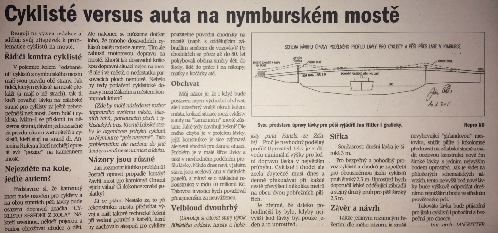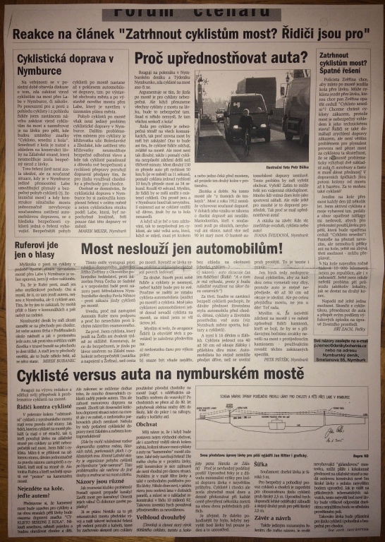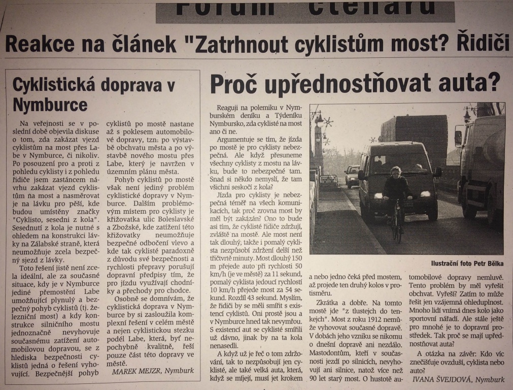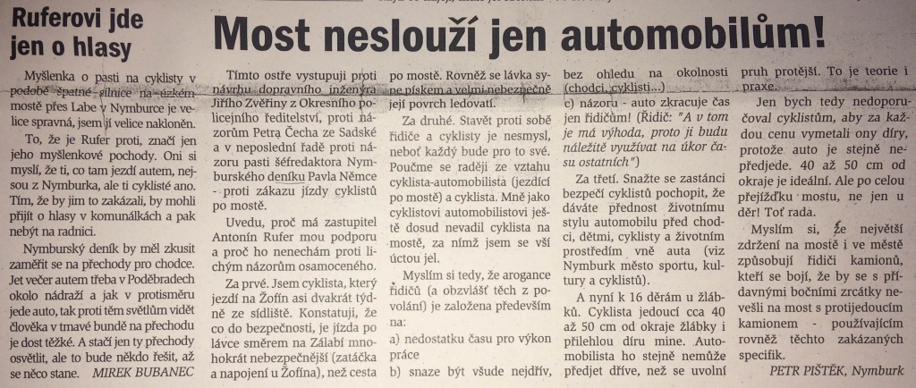 V polemice kolem „odstranění“ cyklistů z Nymburského mostu mají svou pravdu obě strany. Jak řidiči, kterým cyklisté na mostě překáží (a mají o ně strach), tak ti, kteří považují lávku na zálabské straně pro cyklisty za ještě nebezpečnější, než most. Jsem řidič i cyklista. Mám-li se přiklonit na některou stranu, dávám jednoznačně za pravdu názoru zastupitelů a cyklistů, kteří stojí na straně Antonína Rufera a kteří nechtějí opustit své „pozice“ na kamenném mostě.