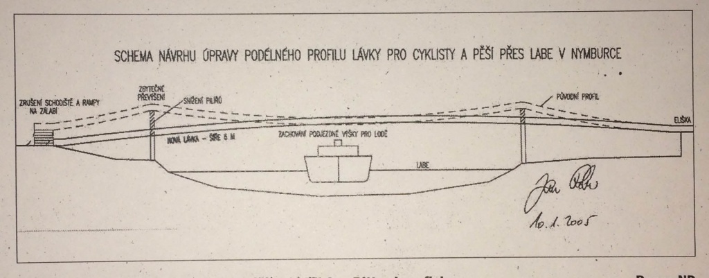 "Lávka z roku 1985 byla podle mého špatná funkčně, provozně i technicky a navrhoval jsem tehdejšímu vedení radnice a odboru správy majetku její výměnu," říká architekt Jan Ritter starší. 12. ledna 2005 o tom vyšel článek v Nymburském deníku. Byly k němu i skicy: