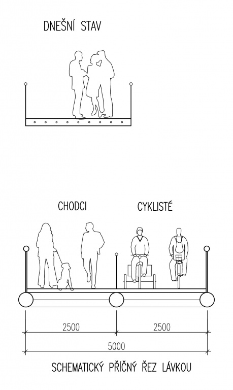Pro bezpečný a pohodlný provoz cyklistů a chodců je zapotřebí pro obousměrnou jízdu cyklistů pruh široký 2,5 m. Uprostřed bych doporučil lehké oddělující zábradlí a stejný druhý pruh pro pěší široký 2,5 m.