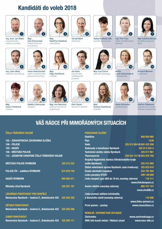 Už více než deset let pracujeme v zastupitelstvu, patříme k nejvíce aktivním zastupitelům a již se nám podařilo řadu našich předsevzetí a slibů splnit. Do dalších let se chceme soustředit především na zlepšení komfortu pro Vás, Nymburáky, skrze opravu zanedbaných částí města a zlepšení dopravní situace. Posílíme úklid a investice do veřejného prostoru, aby se Vám v Nymburce žilo lépe. Rozhýbali jsme řadu opomíjených projektů, otevřeli radnici a zlepšili servis pro všechny občany.